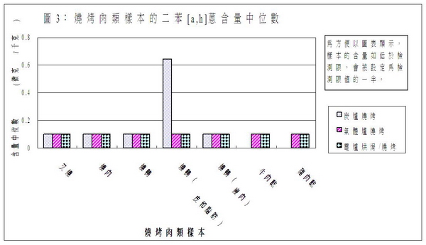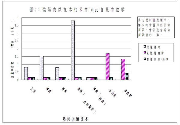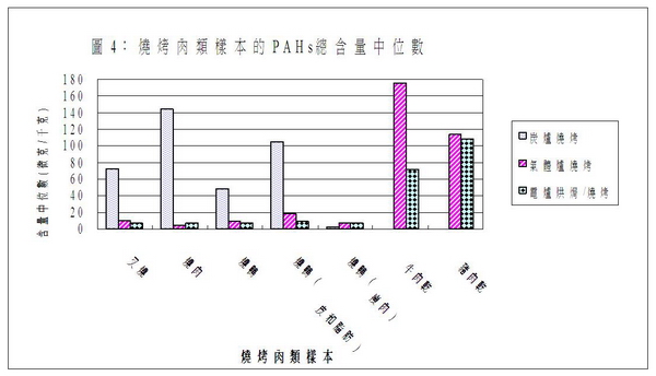 43. 炭 炉 烧 烤 的 烧 味 样 本 当 中 , PAHs 总 含 量 中 位 数 最 高 的 是 烧 肉 ( 含 量 中 位 数 为 144.7 微 克 / 千 克 ) , 其 次 是 叉 烧 (72.6 微 克 / 千 克 ) 和 烧 鸭 (48.6 微 克 / 千 克 ) 。 不 过 , 根 据 差 异 分 析 , 其 差 别 并 不 显 着 。 从 用 气 体 炉 烧 烤 的 样 本 及 用 电 炉 烘 焗 的 样 本 中 则 观 察 不 到 这 种 情 况 。 而 各 类 烧 味 的 苯 并 [a] 蒽 及 苯 并 [a] 芘 含 量 并 无 显 着 差 别 。