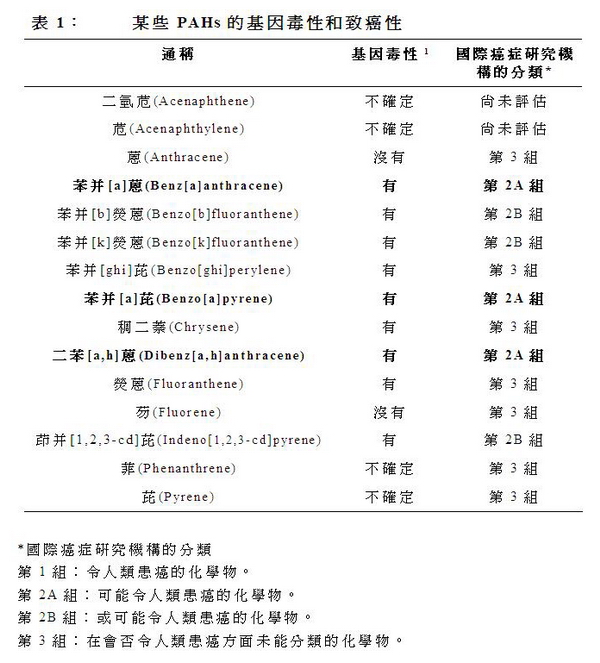 28. 食 物 中 一 般 有 多 种 PAHs 混 合 出 现 , 只 含 有 一 种 PAH 的 情 况 较 为 罕 见 1 。 不 过 , 国 际 组 织 并 没 有 就 食 物 所 含 PAHs 开 列 一 份 建 议 分 析 清 单 。 我 们 在 这 项 研 究 中 分 析 了 表 1 所 列 的 15 种 PAHs , 当 中 包 括 国 际 癌 症 研 究 机 构 列 入 「 第 2A 组 」 的 三 种 PAHs 化 合 物 。 选 取 的 准 则 , 视 乎 其 毒 性 以 及 个 别 PAH 是 否 可 在 本 地 测 试 而 定 。