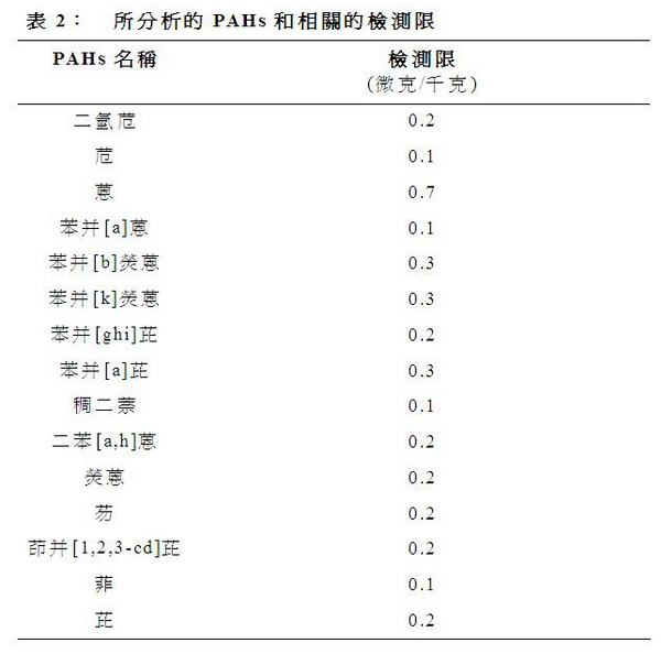 35. 样 本 的 化 验 分 析 工 作 由 食 环 署 食 物 研 究 化 验 所 进 行 。 化 验 所 人 员 把 所 有 样 本 均 化 , 然 后 以 冻 结 干 燥 法 把 样 本 弄 干 。 化 验 所 人 员 抽 取 了 以 湿 重 计 约 达 5 克 的 样 本 作 为 代 表 部 分 来 测 试 , 首 先 是 把 这 个 部 分 皂 化 , 再 以 环 己 烷 萃 取 所 含 的 PAHs , 然 后 以 固 相 萃 取 柱 来 淨 化 , 最 后 利 用 气 相 色 谱 质 谱 联 用 仪 进 行 测 试 , 并 以 PAH-C13 作 为 这 项 测 试 的 代 替 物 。 15 种 有 关 PAHs 的 检 测 限 , 分 别 为 每 千 克 0.1 微 克 至 0.7 微 克 不 等 , 而 它 们 与 外 国 以 类 似 分 析 方 法 进 行 研 究 所 定 的 检 测 限 相 若 。 化 验 所 人 员 所 分 析 的 PAHs 及 相 关 的 检 测 限 载 于 表 2 。