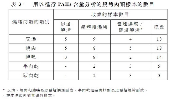 这 项 研 究 研 究 了 肉 干 和 烧 味 这 两 种 烧 烤 肉 类 , 而 其 中 烧 味 包 括 叉 烧 、 烧 肉 和 烧 鸭 。 我 们 从 本 地 的 食 物 制 造 厂 和 普 通 食 肆 收 集 了 合 共 60 个 烧 烤 肉 类 的 样 本 , 又 以 用 水 煮 熟 的 猪 肉 和 鸭 肉 作 为 对 照 样 本 。 PAHs 的 化 验 分 析 工 作 由 食 物 环 境 卫 生 署 食 物 研 究 化 验 所 进 行 。