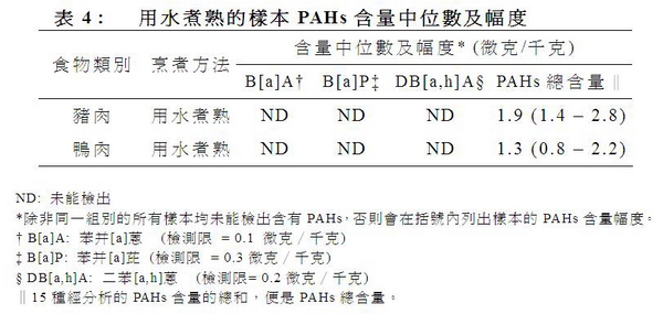 6. 烘 焗 、 烧 烤 、 烟 燻 等 加 工 或 烹 煮 食 物 的 方 法 会 产 生 PAHs , 增 加 食 物 的 PAHs 含 量 。 [2] 差 不 多 烧 焦 食 物 的 任 何 部 分 都 含 有 PAHs[5] , 但 以 某 些 方 法 ( 例 如 蒸 ) 烹 煮 的 食 物 , 只 会 含 有 非 常 小 量 的 PAHs 。 一 项 研 究 的 结 果 显 示 , 用 烘 焗 及 炭 炉 烧 烤 的 方 法 烹 调 的 鸭 肉 , 以 每 千 克 鸭 肉 计 , PAHs 总 含 量 分 别 高 达 130 和 320 微 克 , 但 用 蒸 煮 的 方 法 烹 调 的 , 以 每 千 克 鸭 肉 计 , PAHs 总 含 量 则 少 于 8.6 微 克 。 [6]