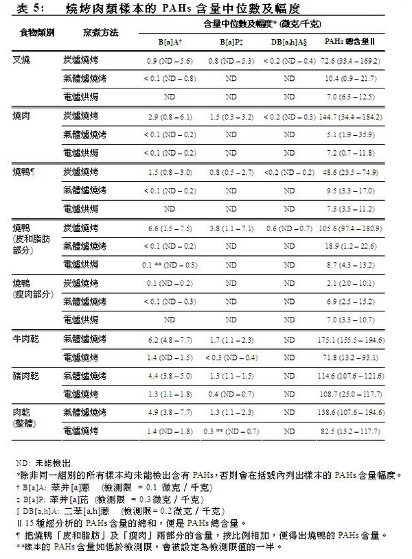 40. 测 试 结 果 发 现 55% 的 烧 烤 肉 类 样 本 的 PAHs 含 量 低 于 检 测 限 。 各 个 样 本 的 PAHs 含 量 差 距 甚 大 , 即 使 以 同 一 种 烹 煮 方 法 制 成 的 同 一 类 食 物 的 样 本 , 也 有 这 情 况 出 现 。 以 不 同 烹 煮 方 法 制 成 的 各 种 烧 烤 肉 类 的 PAHs 含 量 载 于 表 5 , 相 关 的 分 布 图 则 载 于 附 表 V 。