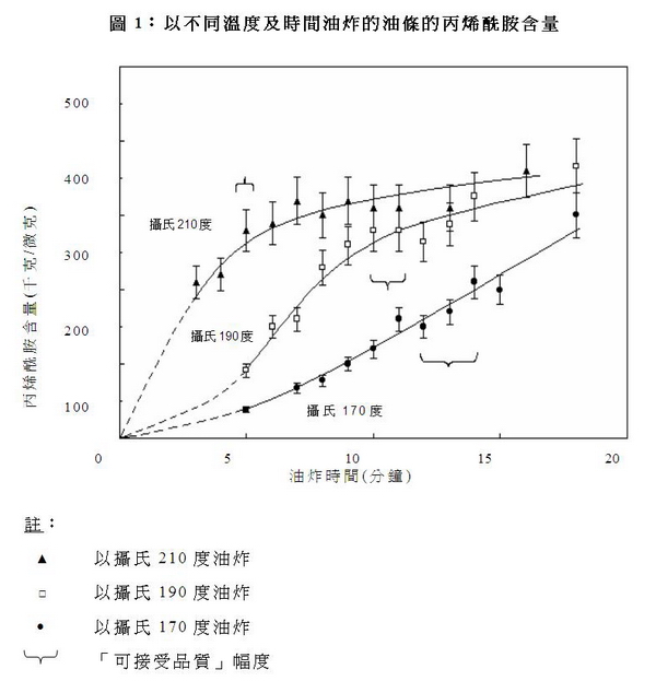20. 以 三 种 不 同 油 炸 温 度 炸 成 的 油 条 , 丙 烯 酰 胺 含 量 一 般 随 油 炸 时 间 加 长 而 稳 步 上 升 , 由 生 麫 团 的 丙 烯 酰 胺 含 量 少 于 可 检 测 水 平 , 增 至 每 千 克 油 炸 过 度 之 油 条 含 约 350 微 克 丙 烯 酰 胺 的 稳 定 水 平 。 油 条 如 在 摄 氏 170 度 的 滚 油 中 炸 18 分 钟 , 在 整 个 油 炸 过 程 中 , 其 丙 烯 酰 胺 含 量 会 缓 慢 而 稳 步 上 升 。 油 温 达 摄 氏 210 度 时 , 麫 粉 条 下 锅 后 , 丙 烯 酰 胺 含 量 飊 升 , 但 会 在 5 分 钟 后 减 慢 , 然 后 渐 趋 稳 定 。 如 果 油 温 是 摄 氏 190 度 , 丙 烯 酰 胺 的 含 量 升 幅 会 在 前 述 两 者 之 间 : 即 在 最 初 约 5 分 钟 内 缓 缓 上 升 , 其 后 颷 升 , 约 10 分 钟 后 减 慢 。
