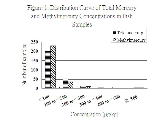 分析结果显示,二百八十个鱼类样本的总汞和甲基汞分别介乎每公斤3 微克至1370 微克及每公斤3 微克至1010 微克﹔含量中位数分别为每公斤63微克及每公斤48微克。 其中二百七十七个样本的总汞和甲基汞含量低于每公斤500微克,占总数99%。只有三个金目鲷样本(品种: 红金眼鲷 Beryx splendens) 的总汞和甲基汞含量高于每公斤500微克 (总汞介乎每公斤609至1 370微克; 甲基汞介乎每公斤509至1010微克)。不同品种鱼类所含的甲基汞占总汞含量的比例由0.46至0.99不等。