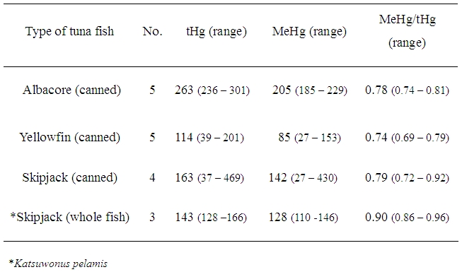 49. 是次检测的罐头吞拿鱼样本(黄鳍吞拿鱼、鲣鱼及长鳍吞拿鱼)甲基汞含量较据报汞含量偏高的两种吞拿鱼 17、20 : 蓝鳍吞拿鱼及大眼吞拿鱼为低。在三个品种的罐头吞拿鱼中,我们验出长鳍吞拿鱼的总汞和甲基汞平均含量较高,这与海外的研究结果相符(表3)。