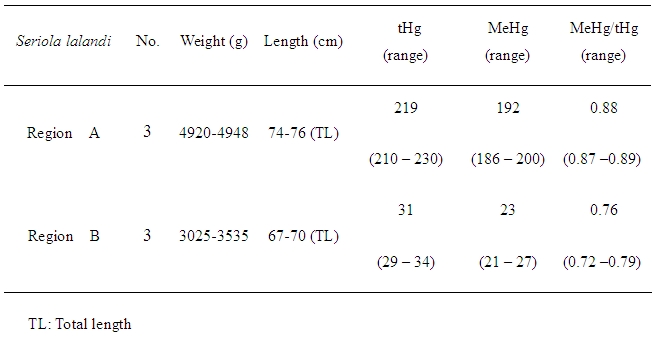 45. 此外,值得一提的是即使同属黄尾鰤(Seriola lalandi)品种,来自不同地区的样本汞含量亦相差很大,结果见表2。主要原因可能是鱼类的生活环境和年龄不同)。这表明除了品种之外,生活环境和年龄也是可影响汞含量的因素。