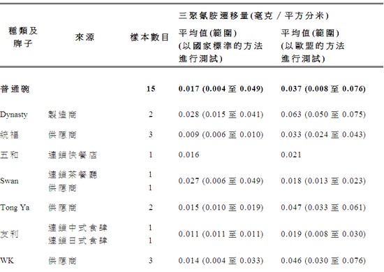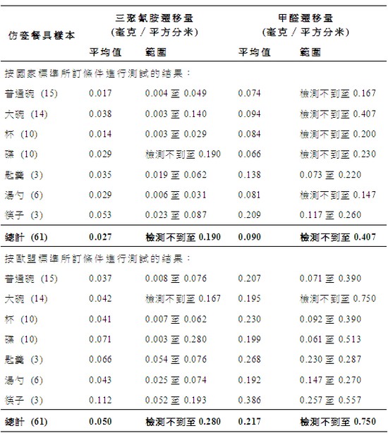 56.我们抽取和分析了合共61个仿瓷餐具样本,当中包括7种餐具,涉及9个牌子。餐具样本的三聚氰胺和甲醛迁移量检测结果详载于附件II和附件III。至于不同仿瓷餐具样本的研究结果,则分别按种类、牌子和来源列载于表1、表2及表3。根据国家标准的方法进行测试,仿瓷餐具的三聚氰胺整体平均迁移量(定量限为每平方分米0.003毫克)为每平方分米0.027毫克(范围介乎检测不到至每平方分米0.190毫克),而采用欧盟的方法进行测试,则为每平方分米0.050毫克(范围介乎检测不到至每平方分米0.280毫克)。至于仿瓷餐具的甲醛整体平均迁移量(定量限为每平方分米0.044毫克),以国家标准的方法进行测试,结果为每平方分米0.090毫克(范围介乎检测不到至每平方分米0.407毫克),而以欧盟的方法进行测试则为每平方分米0.217毫克(范围介乎检测不到至每平方分米0.750毫克)。