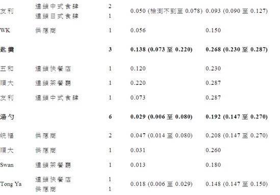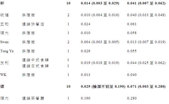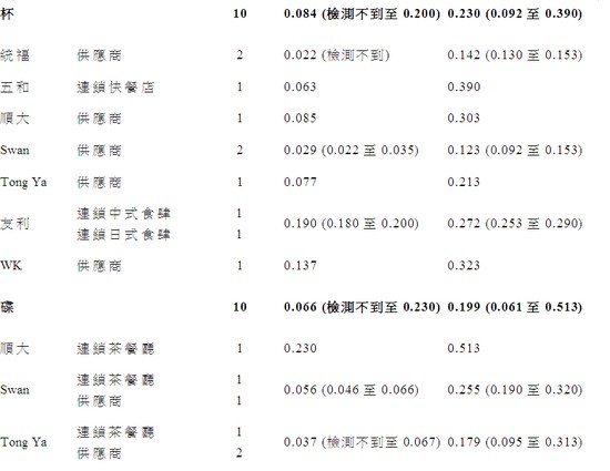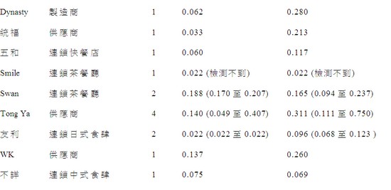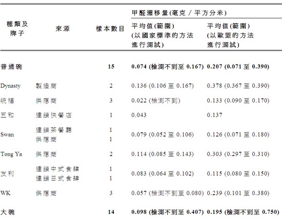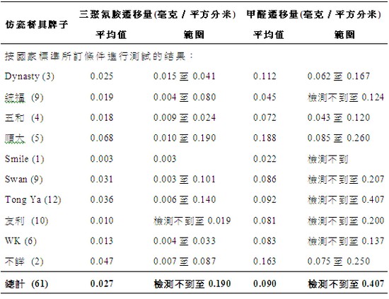 表2︰不同牌子仿瓷餐具样本的三聚氰胺和甲醛迁移量