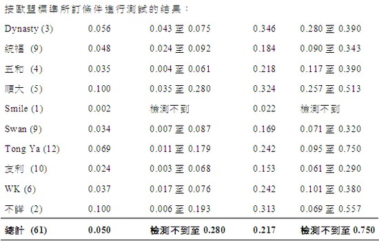 60.研究结果显示,在实验环境模拟最差的情况下,所有仿瓷餐具样本的三聚氰胺和甲醛迁移量都属低水平。根据国家标准的方法进行测试,所有样本的三聚氰胺迁移量都少于每平方分米0.2毫克,甲醛迁移量则少于每平方分米0.5毫克。根据欧盟的方法进行测试,所有样本的三聚氰胺迁移量都少于每平方分米0.3毫克,甲醛迁移量则少于每平方分米0.8毫克。这项研究检测到的三聚氰胺和甲醛迁移量均低于国家标准∕欧盟订定的迁移限量(见表4)。不同种类、牌子或来源的仿瓷餐具样本检出的三聚氰胺和甲醛迁移量范围并无明显差别。