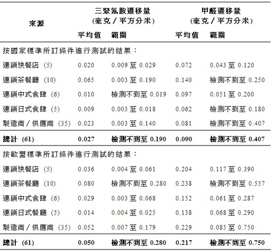 62.这项研究检出的三聚氰胺和甲醛迁移量(根据欧盟的方法进行测试,三聚氰胺迁移量介乎检测不到至每平方分米0.280毫克,甲醛的迁移量则介乎检测不到至每平方分米0.750毫克),远低于英国食物标准局在2004年和2008年的研究结果。根据2004年英国食物标准局的研究,三聚氰胺和甲醛迁移量分别介乎每平方分米0.051毫克至0.90毫克,以及每平方米0.055毫克至190毫克。英国的研究显示,有13个样本甲醛迁移量超出欧盟的限量(2004年的研究,50个样本中有5个;2008年的研究,50个样本中有8个),当中1个来自土耳其,2个来自中国,余下10个则产地来源不详。这项研究检测的样本中,并无在英国两项研究不符合标准的牌子。