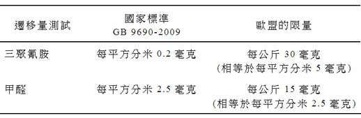 表4:国家标准和欧盟订定的三聚氰胺和甲醛迁移限量