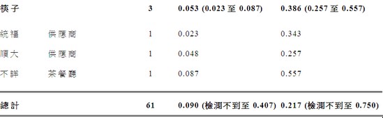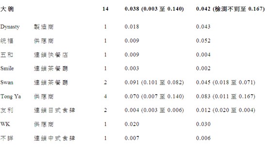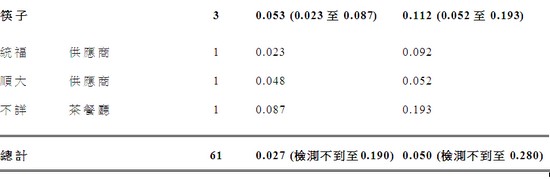 44.第一和第二阶段的抽样工作收集了合共73个仿瓷餐具样本,其中61个适合送交食物研究化验所检测。这些样本分别来自1家连锁快餐店(5个样本)、2家连锁茶餐厅(10个样本)、1家连锁中式食肆(6个样本)、2家连锁日式食肆(5个样本)、1家制造商(3个样本)和3家提供仿瓷餐具给本地食肆的供应商(32个样本),当中包括7种仿瓷餐具,涉及9个牌子。这7种仿瓷餐具包括普通碗(15个样本)、大碗(14个样本)、杯(10个样本)、碟(10个样本)、匙羮(3个样本)、汤勺(6个样本)和筷子(3个样本),而涉及的9个牌子分别为Dynasty (3个样本)、统福(9个样本)、五和(4个样本)、顺大(5个样本)、Smile (1个样本)、Swan (9个样本)、Tong Ya (12个样本)、友利(10个样本)和WK (6个样本)。