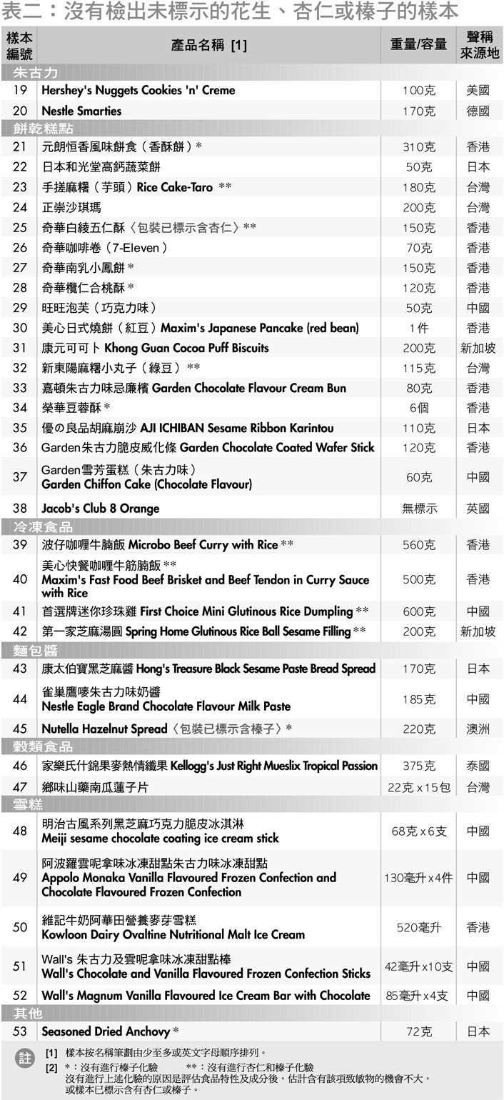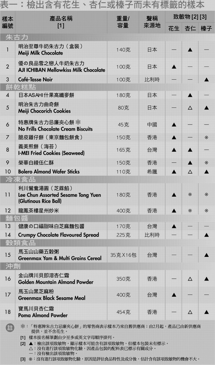 - 结果显示, 18款检出未标籤的花生、杏仁或榛子。部分代理商或生产商已更换新标籤,提醒消费者产品可能含有上述致敏物。
