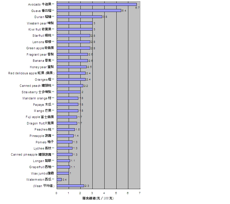 18. 在我们日常的饮食中,水果是膳食纤维的重要来源。图 1 所列的水果,每 100 克含 0.4 克至 6.7 克膳食纤维,平均含 2.3 克。当中,牛油果、番石榴、榴梿、奇异果和啤梨的纤维含量最高。