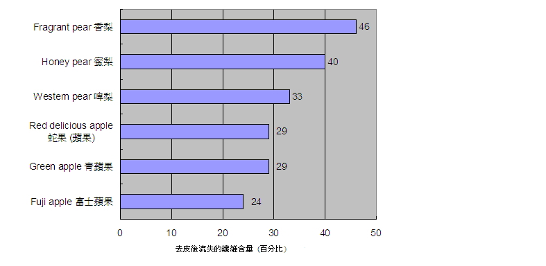 19. 不过,水果的膳食纤维含量会因处理方法而改变。我们研究过啤梨、香梨、蜜梨、青苹果、富士苹果、蛇果和提子在去皮前和去皮后的膳食纤维含量,发现这些水果在去皮后,膳食纤维含量流失 24% 至 46%( 图 2) 。结果说明很多膳食纤维是来自水果的皮。