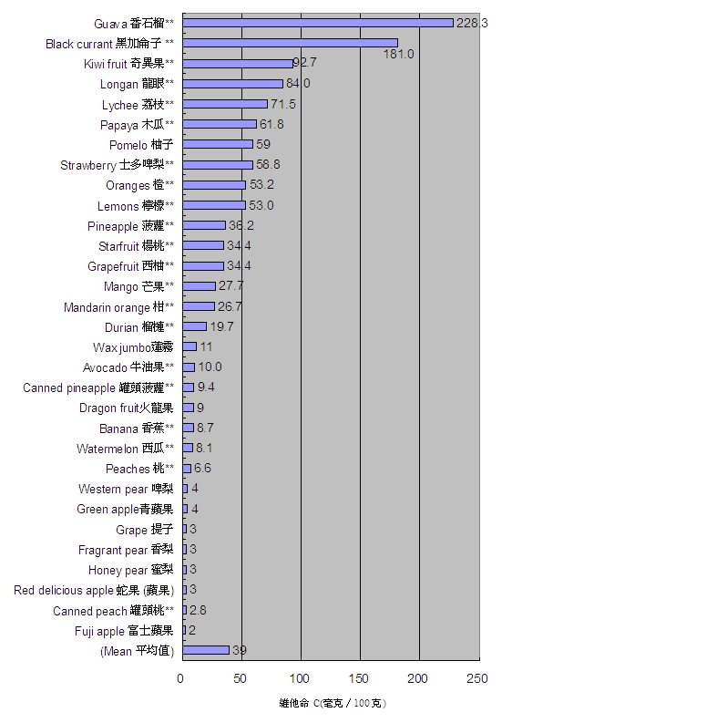 21. 水果是维他命 C 的重要来源。图 3 所列的水果和蔬菜,每 100 克含 2 毫克至 228.3 毫克维他命 C ,平均含 39 毫克。当中,番石榴、黑加仑子、奇异果、龙眼和荔枝含丰富维他命 C( 图 3) 。