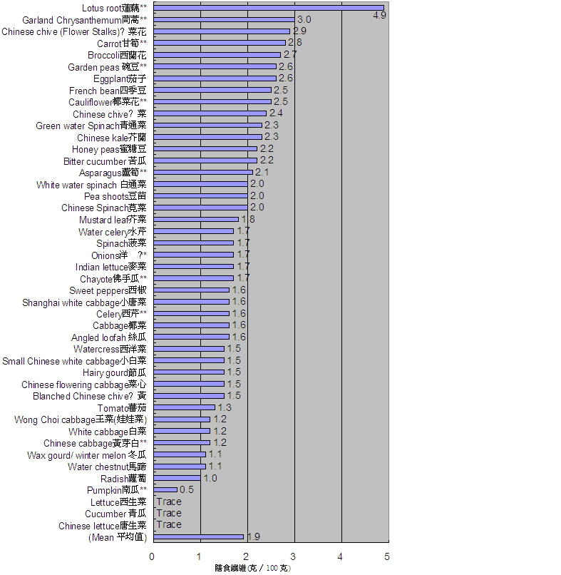 26. 与水果一样,蔬菜也是我们日常饮食中膳食纤维的重要来源。下表所列的蔬菜,每 100 克含 0.5 克至 4.9 克膳食纤维,平均含 1.9 克。莲藕、茼蒿、卫菜花、甘笋和西兰花的膳食纤维含量较高 ( 图 5) 。
