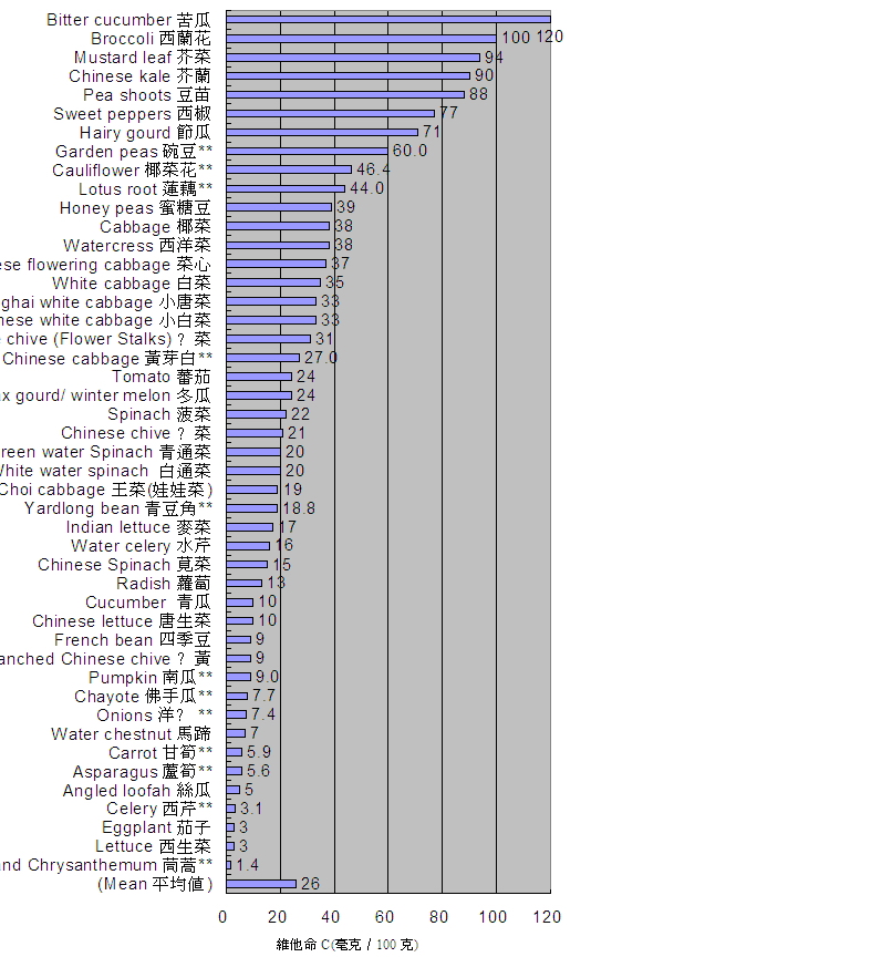 29. 蔬菜是维他命 C 的主要来源。下表 ( 图 6) 所列的蔬菜,每 100 克含 1.4 毫克至 120 毫克维他命 C ,平均含 26 毫克。在下表所列的蔬菜中,苦瓜、西兰花、芥菜、芥兰和豆苗的维他命 C 含量最高。