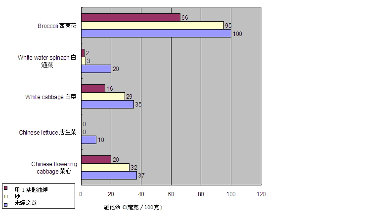 30. 维他命 C 容易受热力破坏。我们拣选了多种蔬菜,研究不同的烹煮方法对这些蔬菜的维他命 C 含量的影响 ( 图 7) 。维他命 C 含量视乎蔬菜类别及烹煮方法而定。炒和焯都是烹煮蔬菜最常用的方法;炒菜所流失的维他命 C 较焯菜少,因为维他命 C 属水溶性,有些或会流失到焯菜用的水中。虽然炒菜所流失的维他命 C 较焯菜少,但炒菜会增加蔬菜的脂肪含量。
