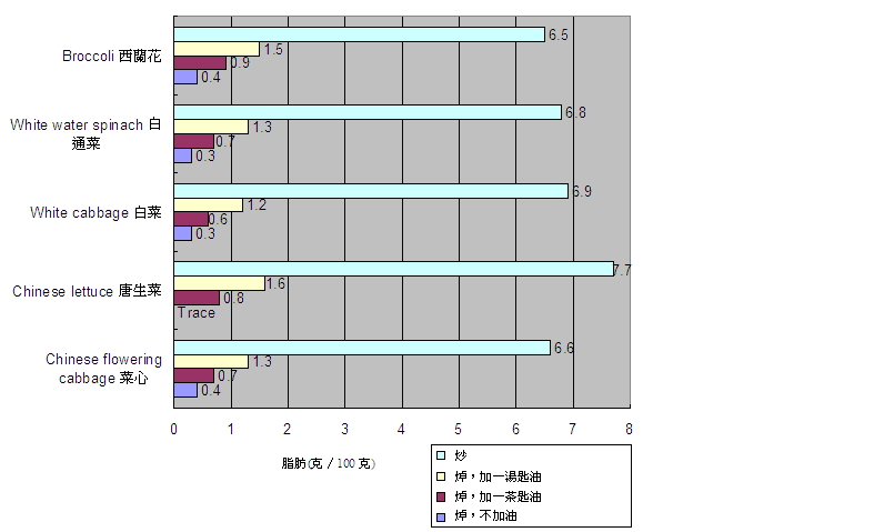 32. 蔬菜的脂肪含量会因采用的烹煮方法而大大不同。研究结果显示,以蒸或不加油焯的方法煮菜,对蔬菜的脂肪含量只会造成轻微甚至没有改变。不过,加油焯或炒菜,与不加油焯的方法比较,每 100 克蔬菜的脂肪含量增加 0.3 至 7.4 克 ( 或每斤增加约 1.8 至 44.8 克 )(1 斤 =605 克 )( 图 9) 。以此计算,所增加的脂肪含量会令每 100 克蔬菜增添 3 至 67 千卡热量。研究发现,以 1 茶匙和 1 汤匙油焯蔬菜,平均来说,蔬菜的脂肪含量会分别增加 1.2 倍和 3.1 倍;以炒的方式烹煮,蔬菜的脂肪含量则会增加 19.3 倍。一般来说,炒的方法较焯熟食物用油较多,用油来煮菜会大大增加蔬菜的脂肪含量。