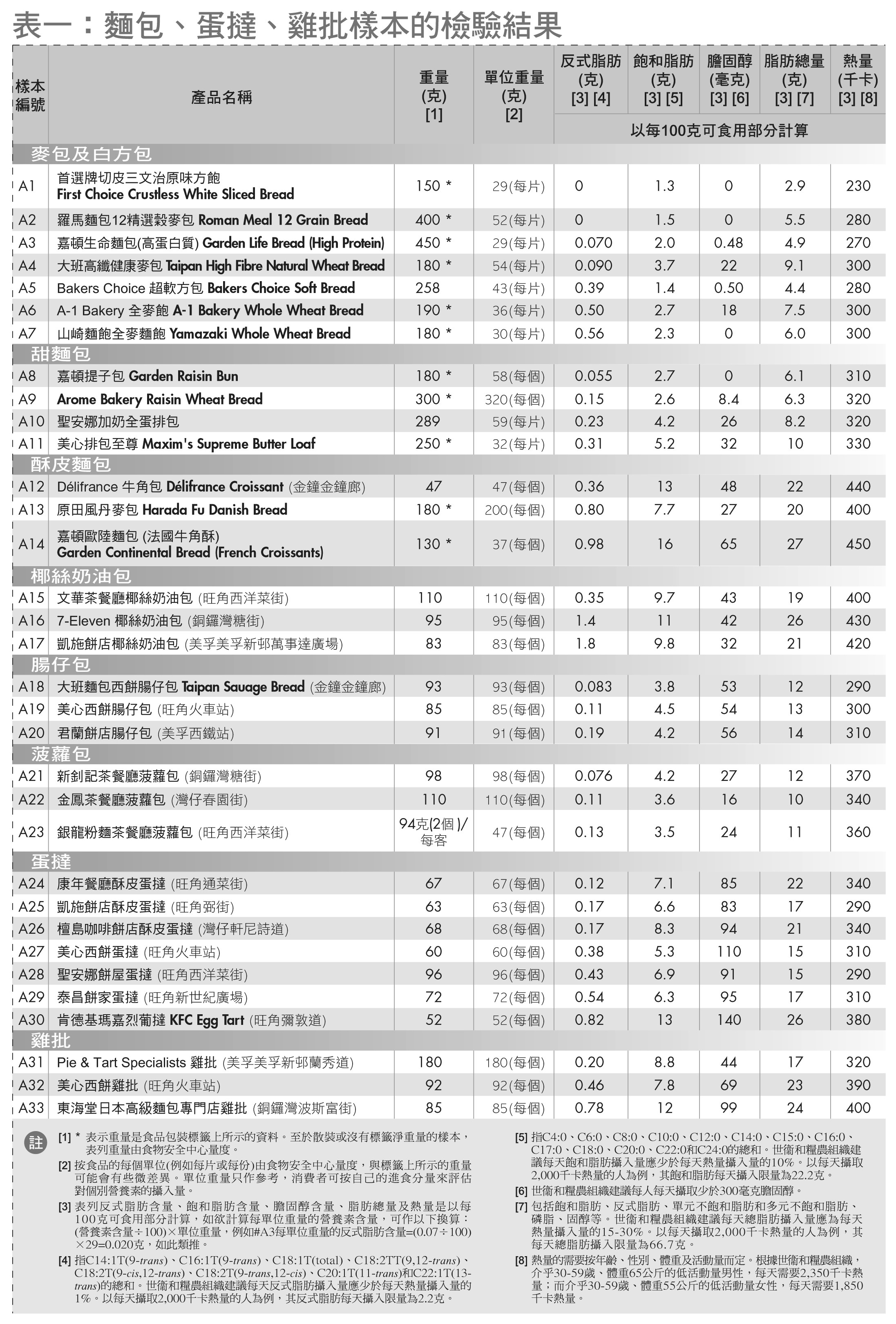 烘焙食品包括面包、蛋挞、鸡批、蛋糕及蛋卷等,它们的反式脂肪含量差距很大,有些含量颇高,有些却只含微量或不含反式脂肪。面包样本由不含反式脂肪至每 100 克 1.8 克反式脂肪。当中椰丝奶油包 #A16 及 #A17 含量较高(分别为每 100 克 1.4 克和 1.8 克),如每天进食一个 #A16 (每个 95 克)或 #A17 (每个 83 克),会分别摄入 1.3 克及 1.5 克反式脂肪,约占一个每天摄取 2,000 千卡热量的人每天反式脂肪建议摄取限量( 2.2 克)的六至七成。