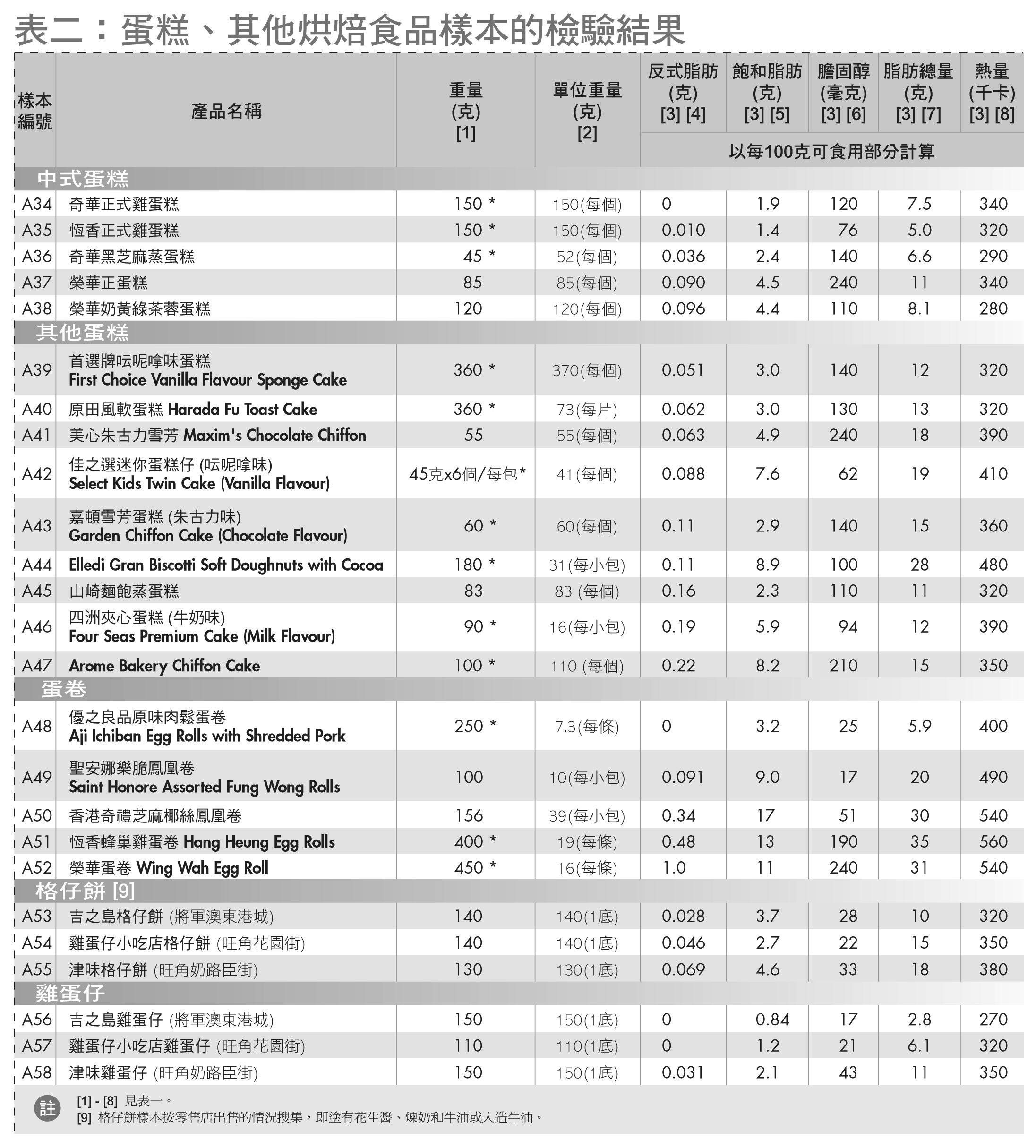 以蛋浆制成的蛋卷、格仔饼及鸡蛋仔样本由不含反式脂肪至每 100 克 1.0 克反式脂肪,当中「荣华蛋卷」( #A52 )每 100 克样本含 1.0 克反式脂肪,比同类食品( #A48-#A51 )所含反式脂肪高。