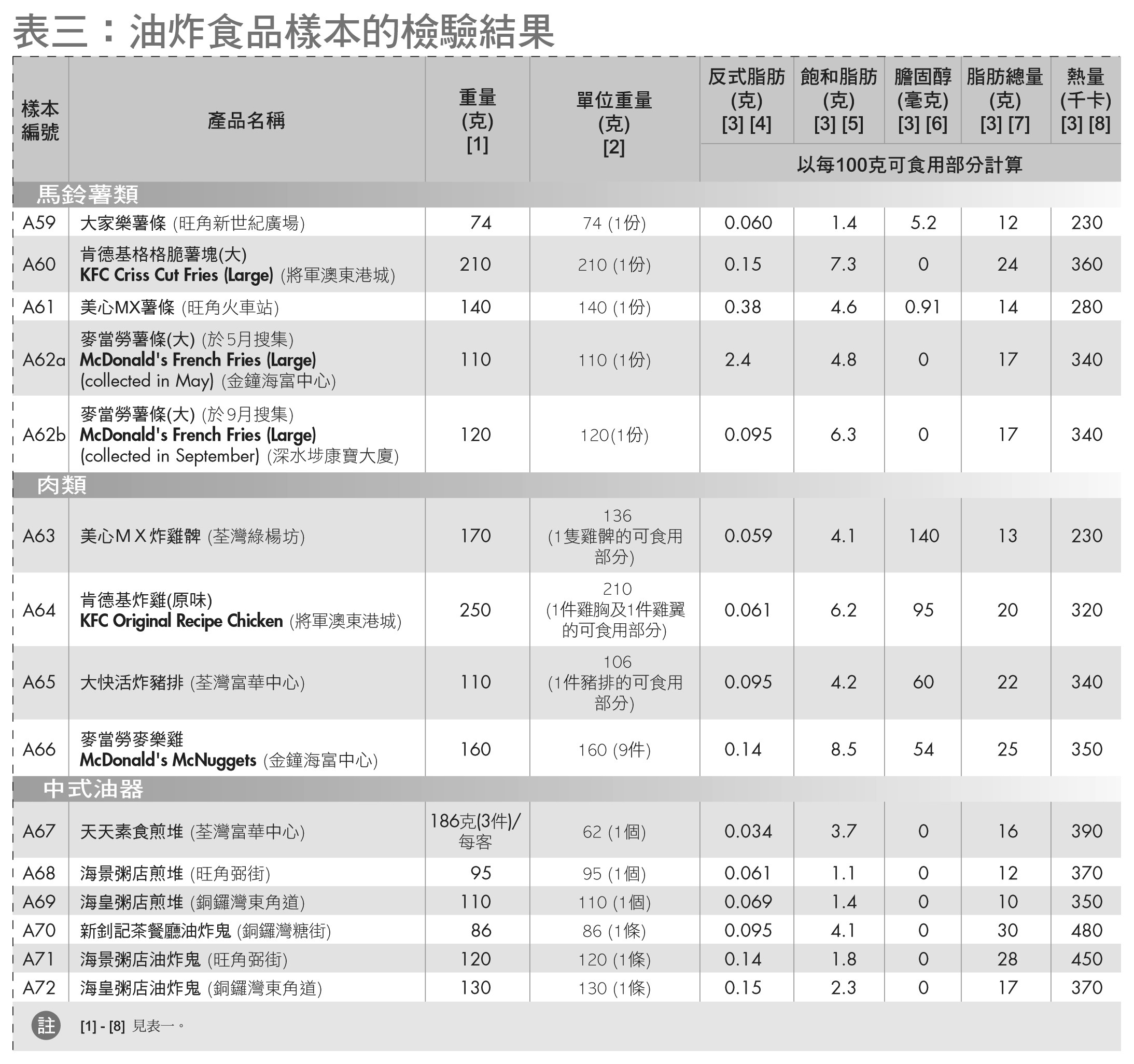 油炸食物的反式脂肪含量由每 100 克 0.034 克至 2.4 克。除「麦当劳薯条」( #A62a )外,其他油炸食物包括炸鸡类、炸猪排及中式油器的反式脂肪含量都不算高。上述「麦当劳薯条」( #A62a )购于 5 月,检测验出其反式脂肪含量为每 100 克 2.4 克。如进食一份( 110 克),便摄取了约 2.6 克反式脂肪,超过一个每天摄取 2,000 千卡热量的人每天建议摄取限量( 2.2 克)。本会其后于 9 月获悉有关公司在 6 月起出售的薯条已改为含低反式脂肪,为验证相关资料,食物安全中心遂于 9 月搜集另一「麦当劳薯条」样本( #A62b )化验,检出反式脂肪含量为每 100 克 0.095 克。