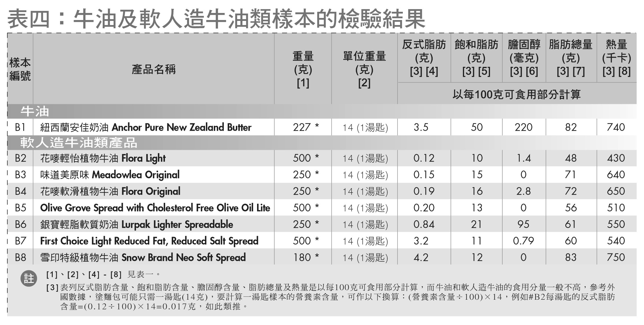 人造牛油类产品可能含有经过氢化的植物油,其反式脂肪含量备受关注。是次测试检验了一个牛油样本与一些软人造牛油类产品作对照。牛油的脂肪含量有一定标准,根据外国测试数据,每 100 克牛油约含 80 克总脂肪, 3-6 克反式脂肪, 45-55 克饱和脂肪及 200-250 毫克胆固醇。测试所用的对照样本,「纽西兰安佳奶油」( #B1 )的反式脂肪(每 100 克 3.5 克)及其他营养素含量与上述的数据相若。由于软人造牛油类产品的配方和制造方法不一,所以反式脂肪及其他营养素(如胆固醇)含量差距较大,样本( #B2-#B8 )的反式脂肪含量由每 100 克 0.12 克至 4.2 克。不过软人造牛油的食用分量一般不高,参考外国数据,涂面包可能只需一汤匙( 14 克),而按测试结果计算,一汤匙软人造牛油( #B2-#B8 )分别含 0.017 克至 0.59 克反式脂肪,但仍须按实际食用量来评估摄入量。