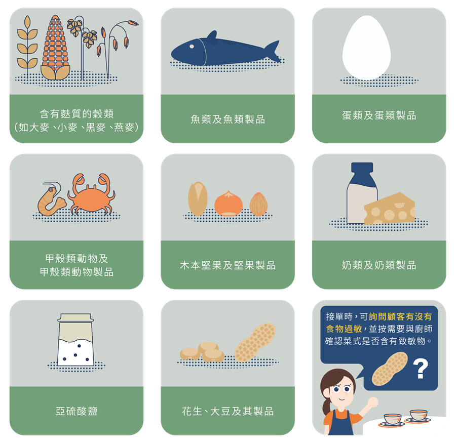 接单时,可訽问顾客有没有食物过敏,并按需要与厨师确认菜式是否含有致敏物。