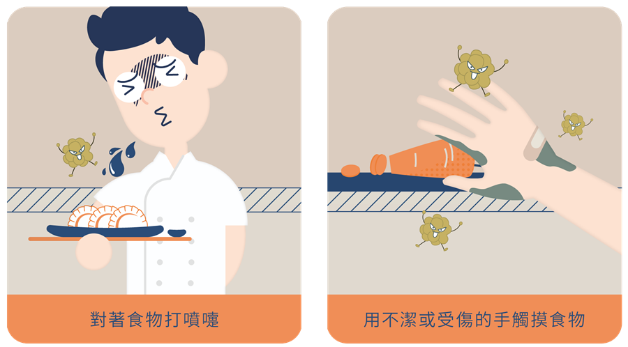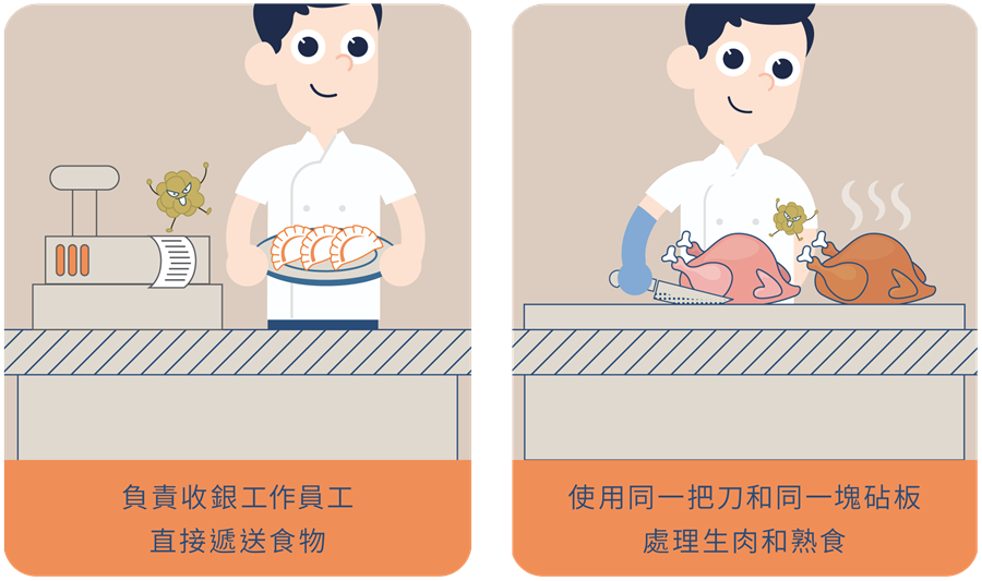 污染物经食物处理人员直接传播至食物,这种污染方式最为普遍,常见例子有: