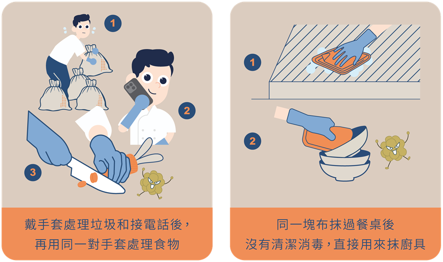 戴手套处理垃圾和接电话后,再用同一对手套处理食物。