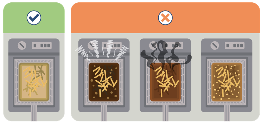 煎炸油如有异常颜色或气味(例如油膉味)、开始冒烟(在建议油炸温度150-180℃冒烟),或出现泡沫 (出现不易消散的奶白色泡沫),便应及时更换。