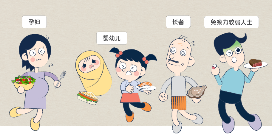 无论透过进食「生冷」食物而感染哪种食源性病原体,高危人士,包括孕妇、婴幼儿、长者及免疫力弱人士,都较大机会出现严重症状,甚至会有生命危险。