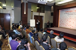 | 消費者委員會公共事務部首席主任李少媚女士李女士(前排左一)與食物專家委員會主席關教授(前排左二)與成員拍攝大合照 | 小組代表與在場人士分享討論成果 |