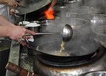 焯 | 將蝦粒、帶子粒、冬菇粒、粟米粒及菜心粒放入沸水焯熟後瀝乾備用。 | 用焯的煮食方法可容易確保食材徹底煮熟,另外亦較生炒方法節省時間。 |