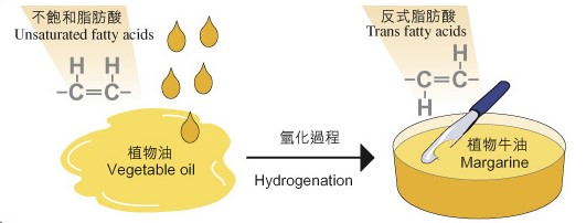 為了延長食物的保質期和增加口感,食品製造商會透過氫化過程改變油中脂肪酸的分子結構。這種改變了結構的脂肪酸稱為「反式脂肪」。我們從飲食中攝取的反式脂肪,主要來自以部分氫化油為材料或用部分氫化油烹調的煎炸和烘焙食品。氫化植物油(例如一些經氫化過程製成的起酥油和人造牛油)通常含大量反式脂肪。