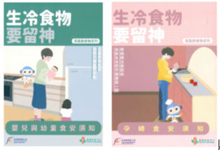 食安中心今年製作了一系列以「生冷食物要留神」為題的單張,讓公眾加深認識「生冷食物」對上述四類高危人士的風險,以免發生食物中毒或更嚴重的併發症。