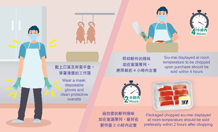 - 未斬件的燒味不利於細菌生長,因此可在室溫下陳列數小時。儘管如此,食物處理人員仍須保持個人和環境衞生,盡可能減少交叉污染。