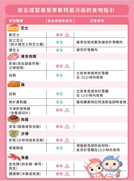 - 應避免進食保質期較長的冷凍即食食品(例如三文魚等冷熏海產、軟芝士和切片凍肉等),除非這些食物已經徹底煮熟。