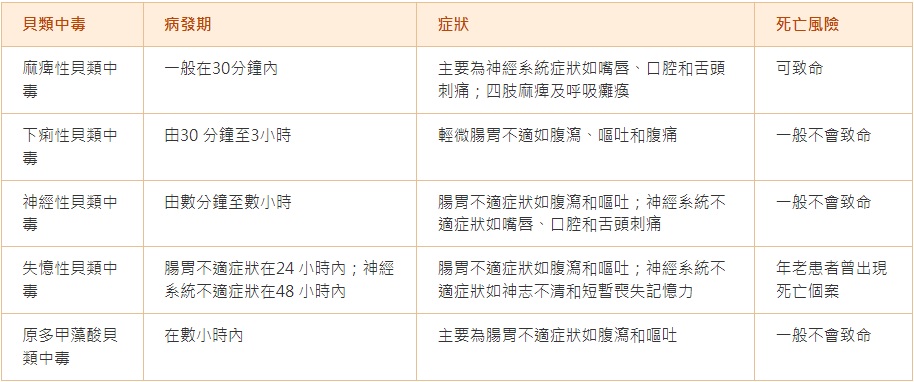 貝類毒素可引起多種不同的病徵,視乎毒素的類別和分量而定。不同類別的貝類中毒症狀綜述如下: