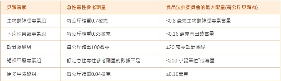 一個由聯合國糧食及農業組織、世界衞生組織和聯合國教科文組織政府間海洋學委員會共同成立的專家工作組曾在二零零四年就多種貝類毒素的毒性進行評估,並為這些貝類毒素訂定了急性毒性參考劑量,即在24小時內可攝入該等毒素而不致對健康帶來明顯風險的分量。食品法典委員會也訂定了雙殼貝類軟體動物的可食用部分(擬供分開食用的全部或任何部分)中貝類毒素的最大限量。急性毒性參考劑量對評估食物中貝類毒素含量的安全性十分重要,而食品法典委員會訂立的最大限量則是食品法典委員會所建議貝類水產中貝類毒素的允許含量。