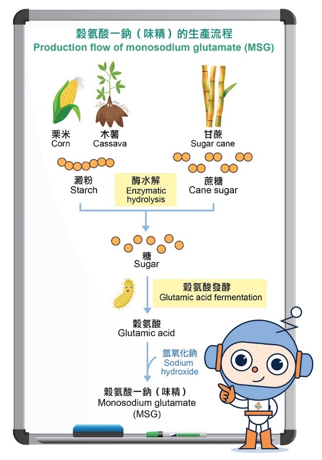味精是沒有氣味的穀氨酸白色結晶鈉鹽,而穀氨酸是大自然中含量最高的氨基酸之一,各種生物包括人類都會產生穀氨酸。目前,多種穀氨酸鹽(例如鉀、鈣、鎂和鈉,統稱為「穀氨酸」)都用作食物增味劑。多種食物如調味料也可能含有天然或人工穀氨酸。味精的商業生產過程使用發酵技術,把多種來源的糖分轉化為穀氨酸(圖)。