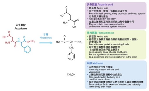 圖:天冬酰胺水解產生天冬氨酸、苯丙氨酸和甲醇