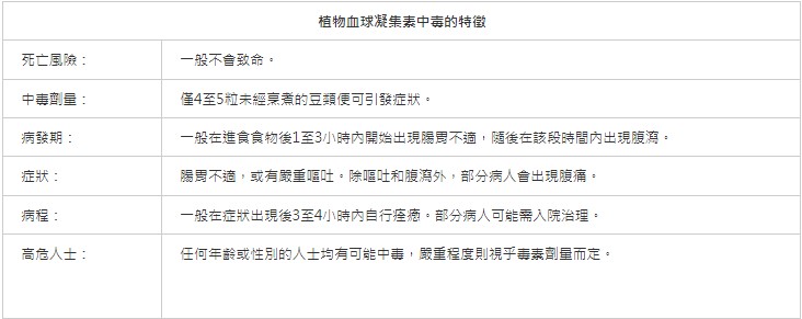 - 多種豆類均含有天然毒素植物血球凝集素。進食未經烹煮的豆類可引致植物血球凝集素中毒。