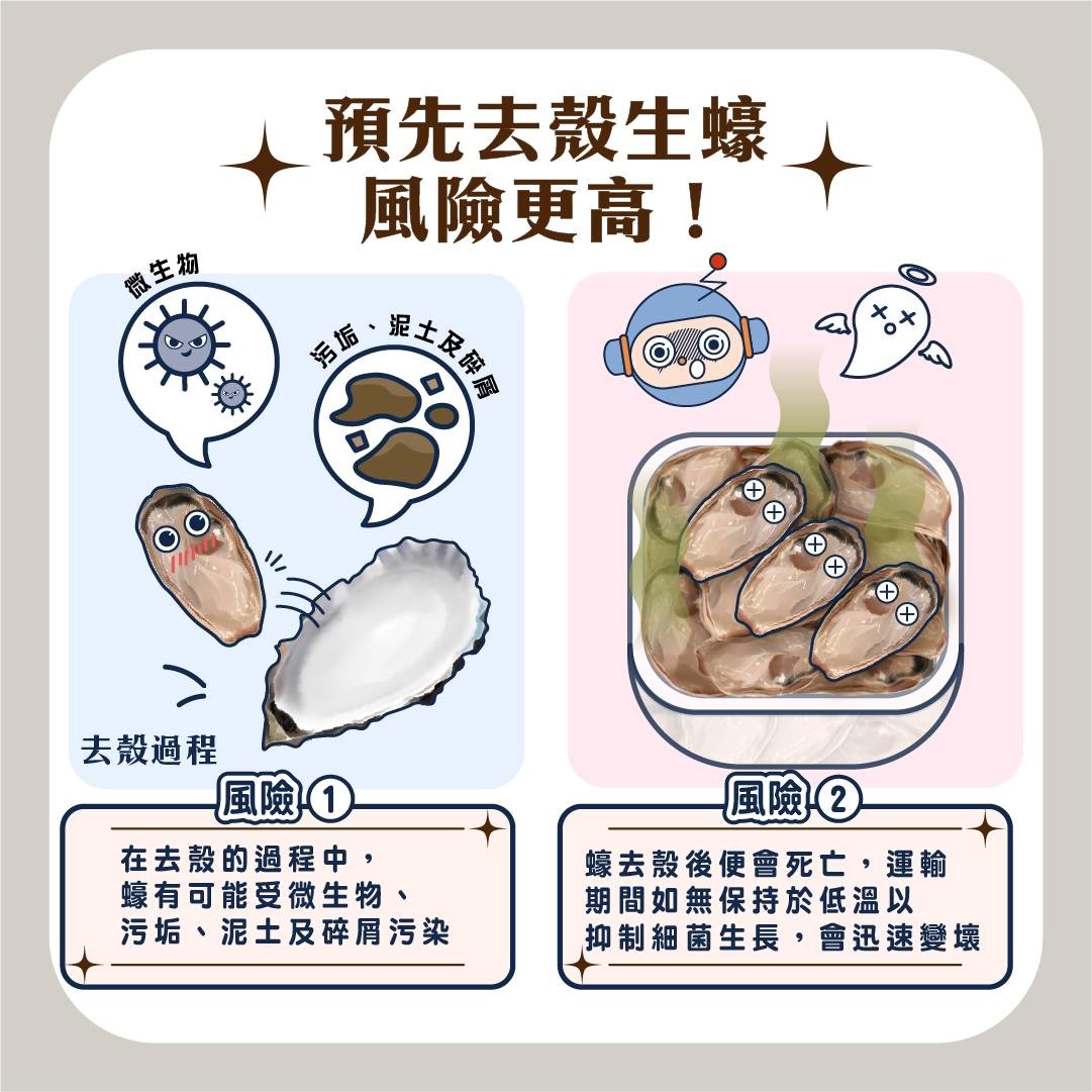 - 高危人士(例如孕婦、嬰幼兒、長者和免疫力弱人士)唔應該進食生或未煮熟嘅蠔,尤其係預先去殼嘅蠔。