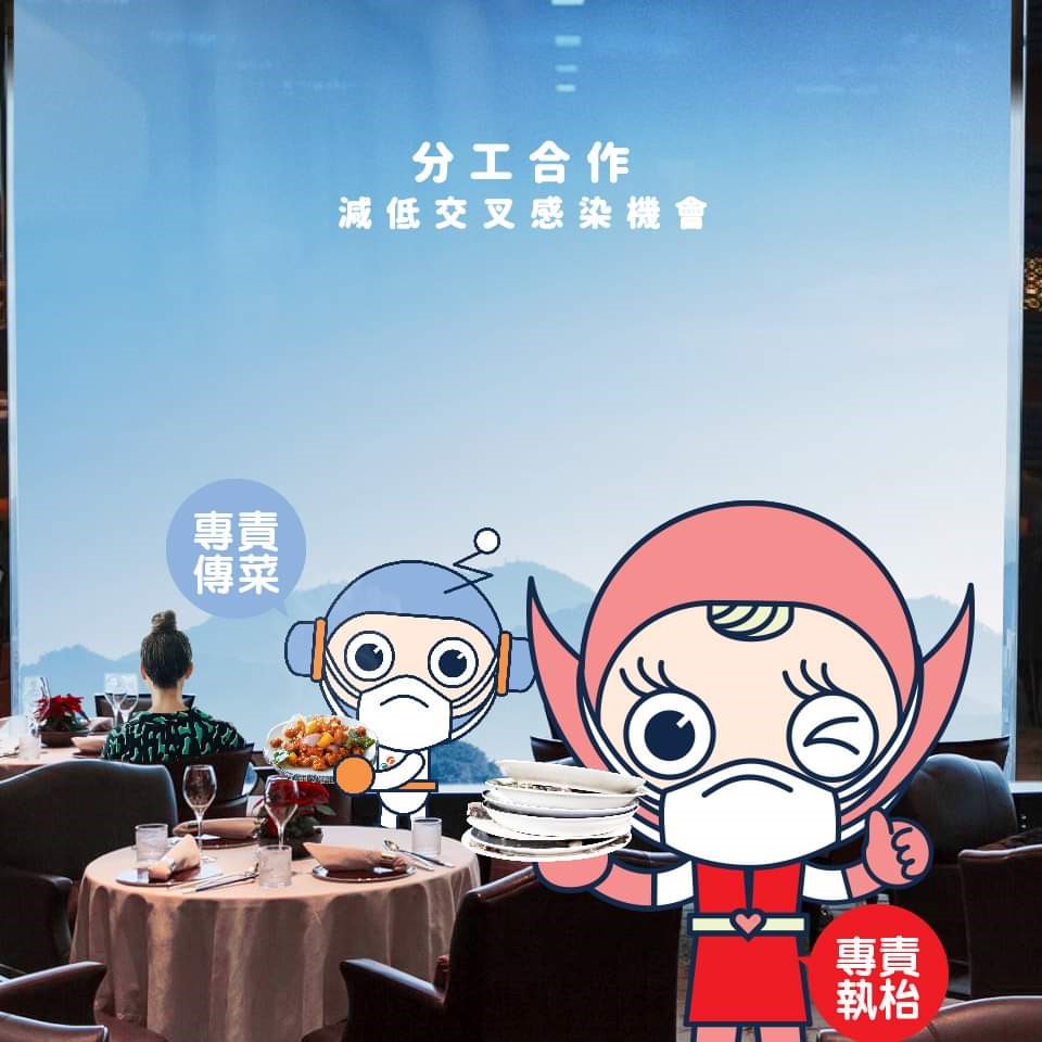為保障食客健康,業界同心抗疫,除實行社交距離措施和提供外賣選擇外,並在員工個人衞生、食物安全和環境衞生方面,加強有關工作。食肆員工在收拾用過的碗碟時,容易接觸到食客殘留在碗碟上的唾液,雙手有可能因此沾染病毒。如果他們沒有徹底清潔雙手,便為其他客人傳菜,就有機會出現交叉感染。為減低交叉感染的風險,食肆應由指定工作人員專責收拾食客用過的餐具,而該等人員不應參與其他工作(包括傳菜)。為方便食客與其他員工分辨上述指定工作人員,該等人員可穿上另一款制服,以資識別。