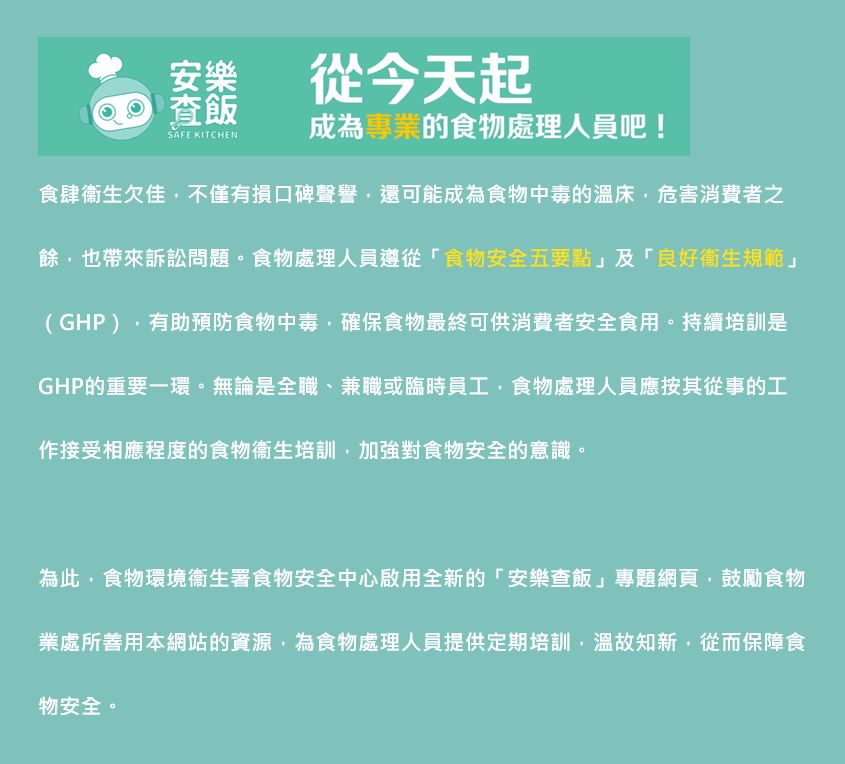 為了促使業界遵守「食物安全五要點」及良好的衞生規範,以及在日常營運中做好食物安全工作,食安中心整合了現有的風險傳達渠道,推出全新的「安樂查飯」食物業界溝通平台,以提供更實用和配合食肆營運需要的食安資訊。