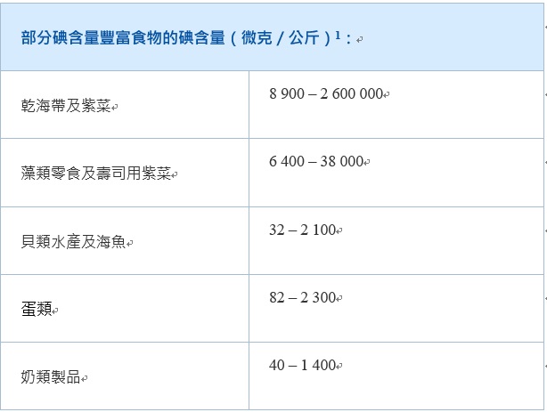 1食物環境衞生署食物安全中心(2011)。《風險評估研究第45號報告書:香港成年人從膳食攝入碘的情況》。