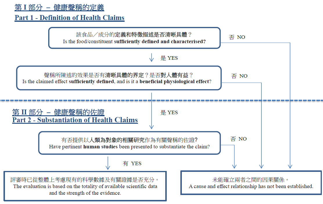 為確定一個健康聲稱是否屬實,歐洲食物安全局主要會從兩方面作出評審。首先,該健康聲稱必須有清晰的定義,這包括對有關食品/成分的特徵及聲稱所陳述的效果作出清晰的界定。其次,該健康聲稱必須有科學證據支持,當中要包括以人類為對象的相關研究。歐洲食物安全局認為,有關該聲稱的關鍵問題只要有一題的答案為否定,便代表其因果關係未能確立(見圖)。