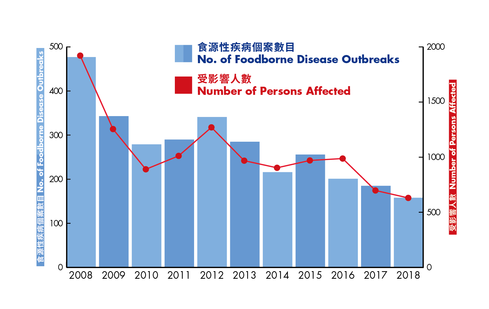 食物中毒是本港法定須呈報的疾病。中心的職責之一,是與衞生署合作調查和監控有關本地食肆及食物業的食物中毒個案。二零一八年,中心接獲158宗由衞生署轉介的食物中毒個案,共有641人受影響。該類轉介個案的數目在過去數年呈現逐漸下跌的趨勢(見圖1)。